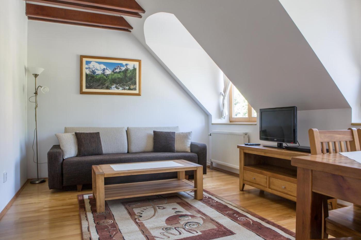 Two-Bedroom Apartment with Mountain View. This spacious apartment with hardwood floors features: - 2 bedrooms - a separate living room with a sofa, an LCD TV and a DVD player - a fully-equipped kitchen with a dining area - a view to the High Tatras Mountains - a bathroom with a shower or a corner bathtub ;